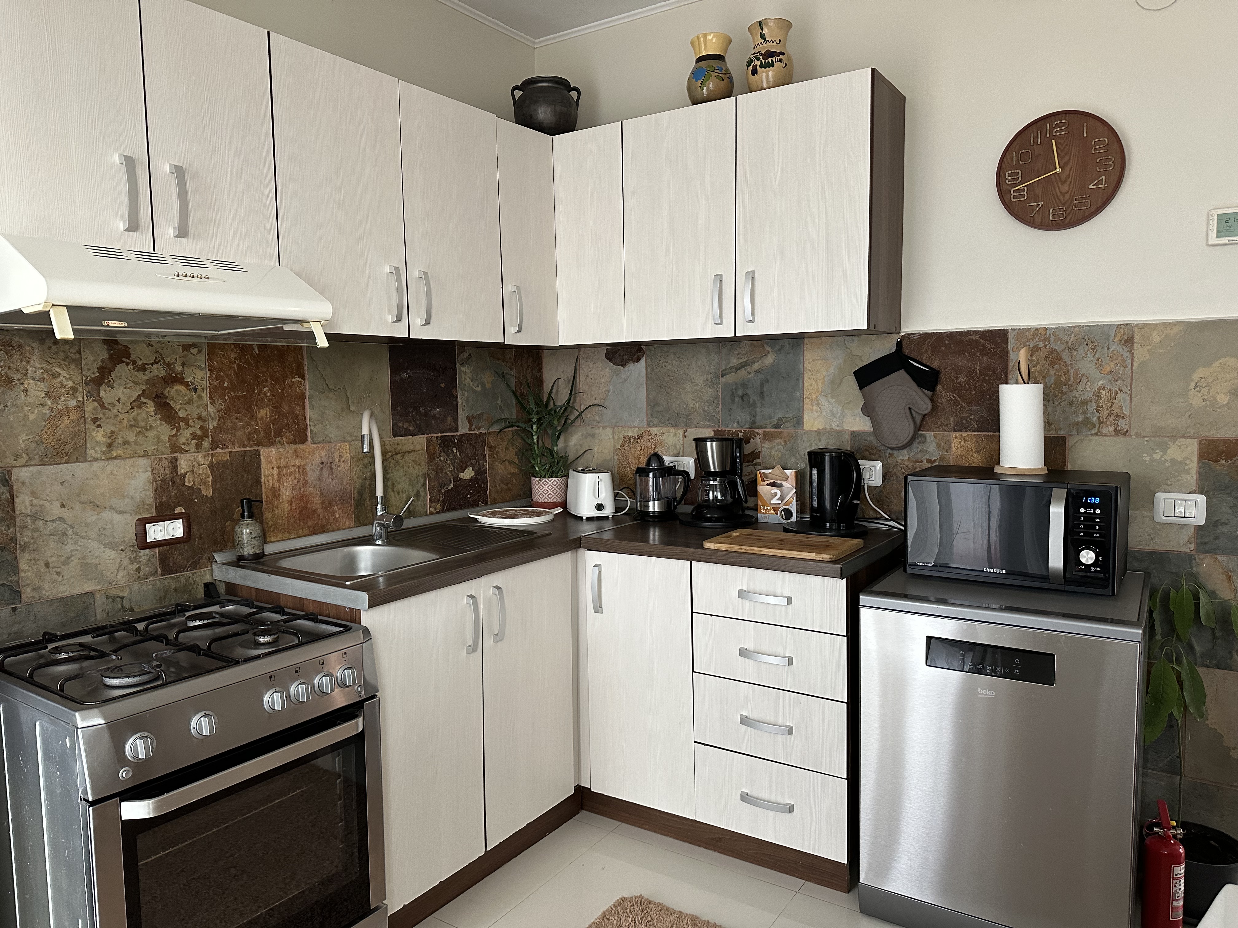 Oaspeții noștri se pot bucura de o bucătărie complet echipată, ce include aragaz, frigider, mașină de spălat vase, cuptor cu microunde, fierbător, cafetieră, prăjitor de pâine și veselă completă. În timpul verii, grătarul în aer liber este pregătit pentru momente plăcute, cu cărbuni și lemne oferite din partea casei.
